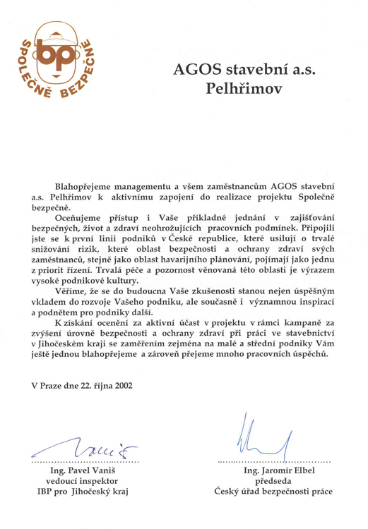 V roce 2002 získala firma ocenění za aktivní účast v projektu SPOLEČNĚ BEZPEČNĚ v zajišťování úrovně bezpečnosti a ochrany zdraví při práci ve stavebnictví.