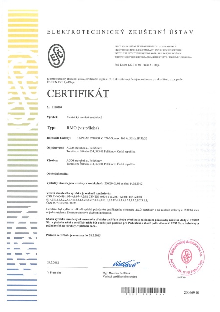 AGOS stavební a.s. Pelhřimov získala následující certifikáty pro výrobu elektrických rozvaděčů :