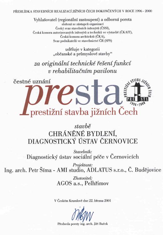 AGOS stavební a.s. Pelhřimov na přehlídce stavebních realizací Jižních Čech "PRESTA" získala čestné uznání za originální technické řešení funkcí v rehabilitačním pavilonu Diagnostický ústav Černovice.